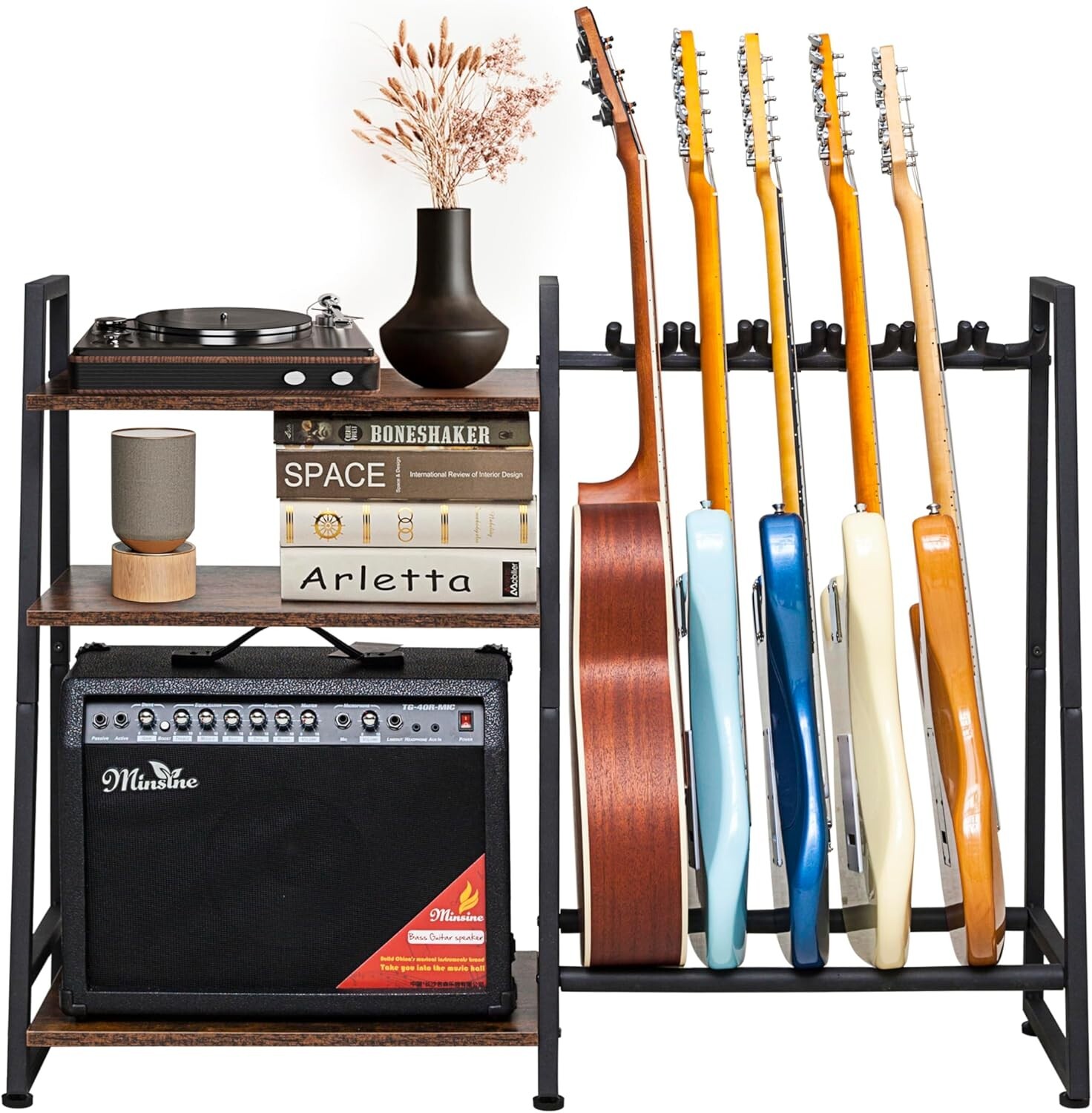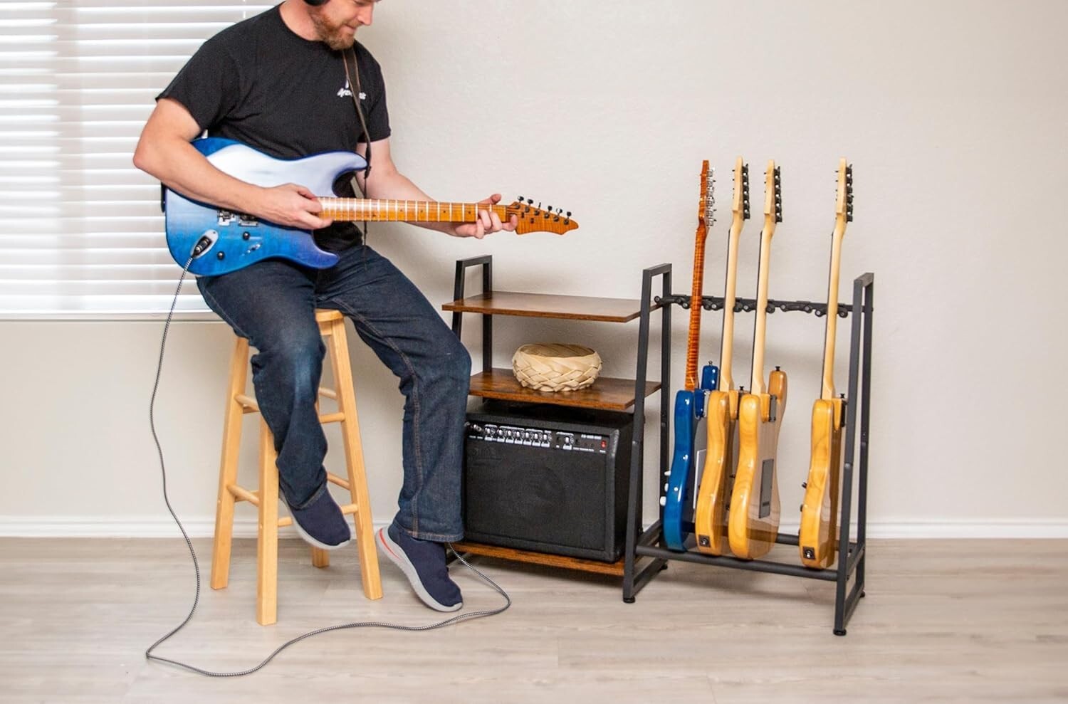 img , span , img li h1 >img button.accordion ul li ul button.accordion.active, button.accordion1:hover div.panel @media only screen and (max-width: 767px) span ul.slides } ul.slides * ul.slides input img label +.carousel-controls label label:hover input:checked+.slide-container input:checked+.slide-container label Adjustable Multi-Guitar Stand & Amp Rack - Holds 5 to 6 Guitars, Rustic Finish ‹ › ‹ › ‹ › ‹ › ‹ › ‹ › ‹ › ‹ › ‹ › ‹ › ‹ › Adjustable Multi-Guitar Stand & Amp Rack - Holds 5 to 6 Guitars, Rustic Finish Versatile Guitar Storage Accommodates up to 5 guitars: acoustic, electric, or bass. Adjustable upper neck mounts for customized spacing. Integrated amp shelf for convenient amplifier storage. Versatile Amp Shelf Secure elevated platform, optimizing space. Reduces bass vibrations for improved sound quality. Accommodates a wide range of mid-