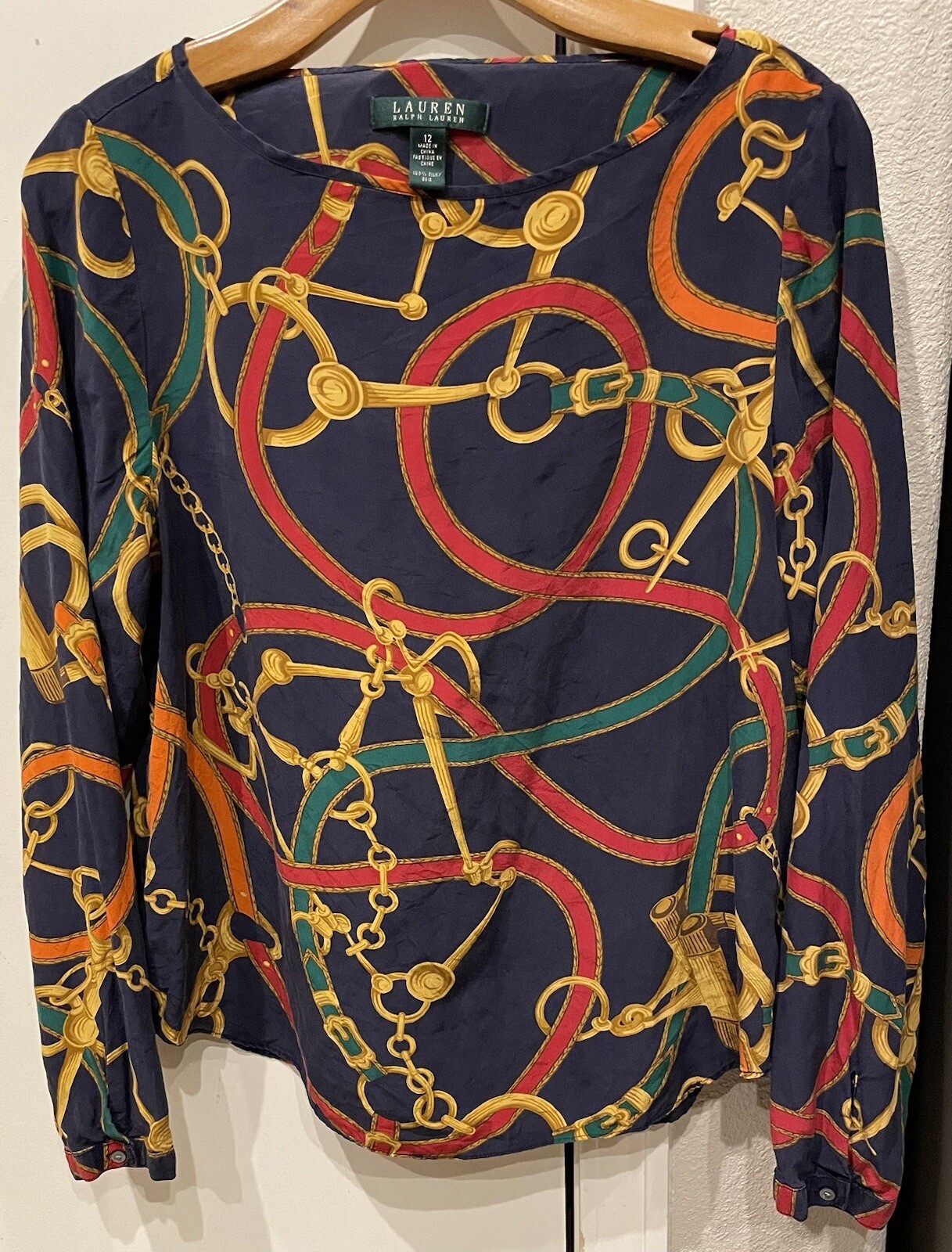 Lauren Ralph Lauren Size 12 Gold Chain Print Silk Long Sleeve Shirt Specs